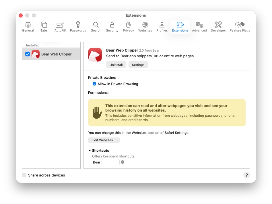 Safari: Bear automatically installs its Safari extension with the main app