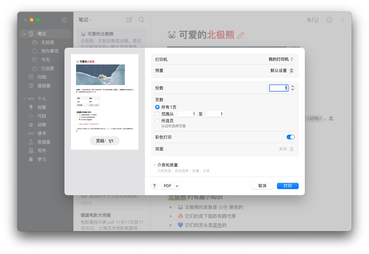 Mac、iPhone 和 iPad 版本的熊掌记均支持打印单篇笔记。